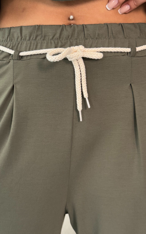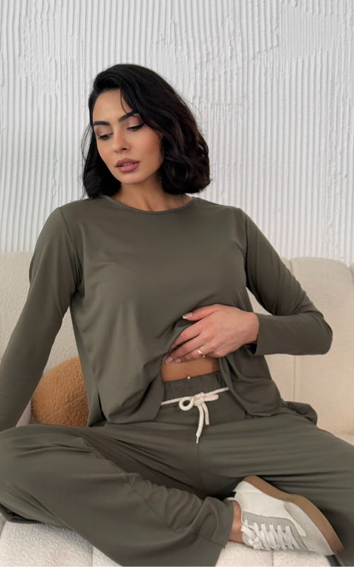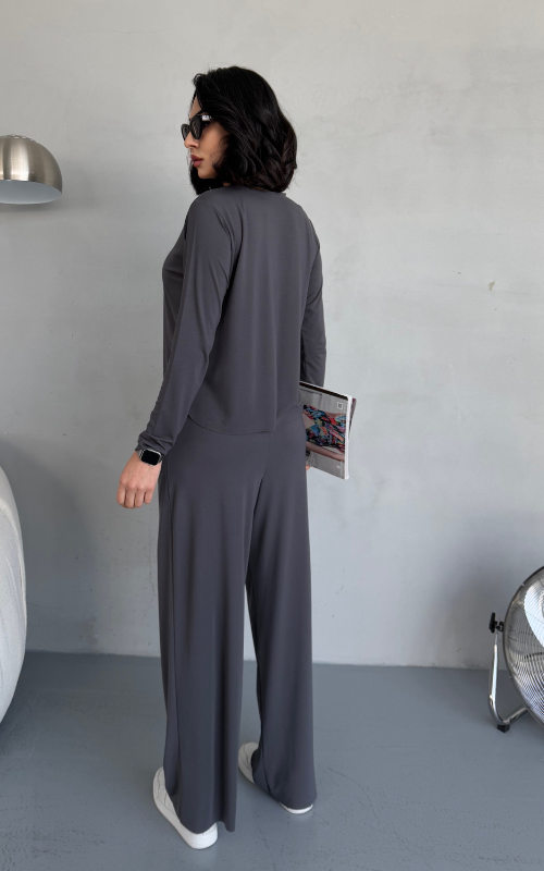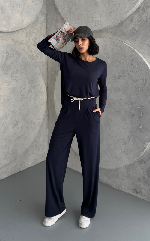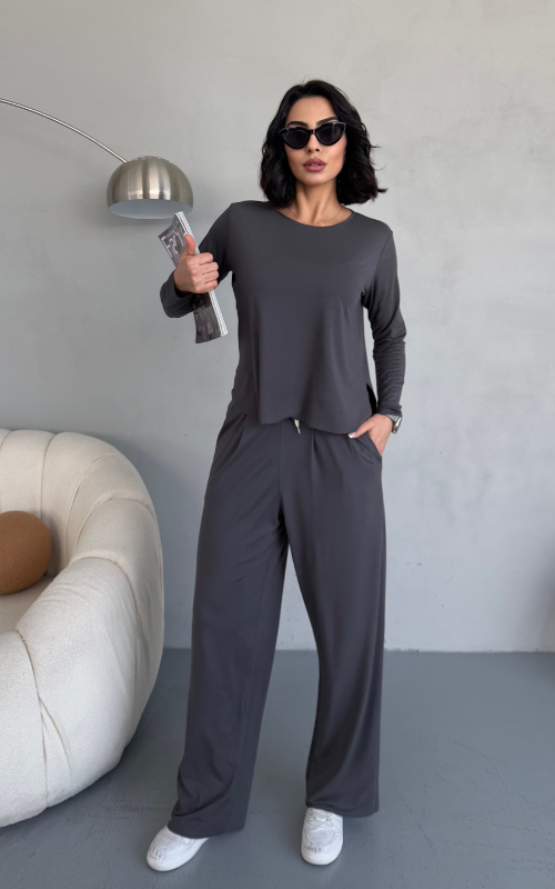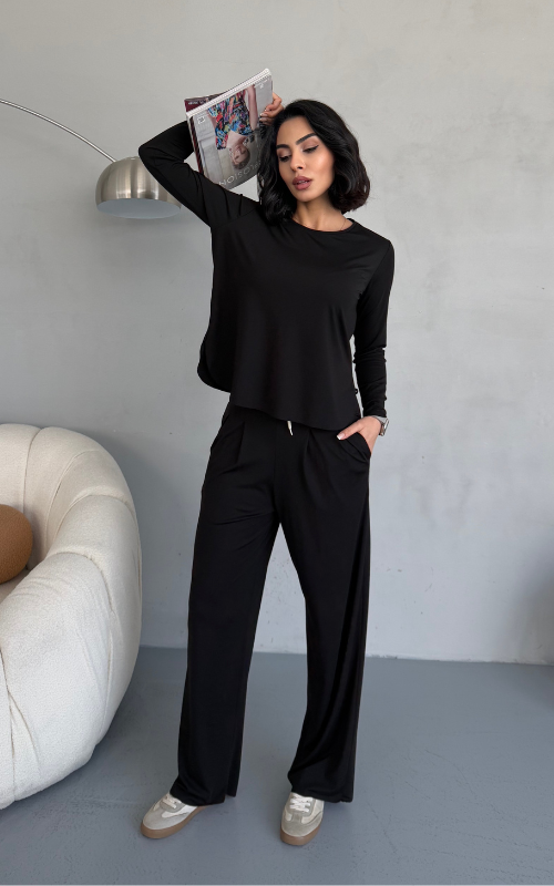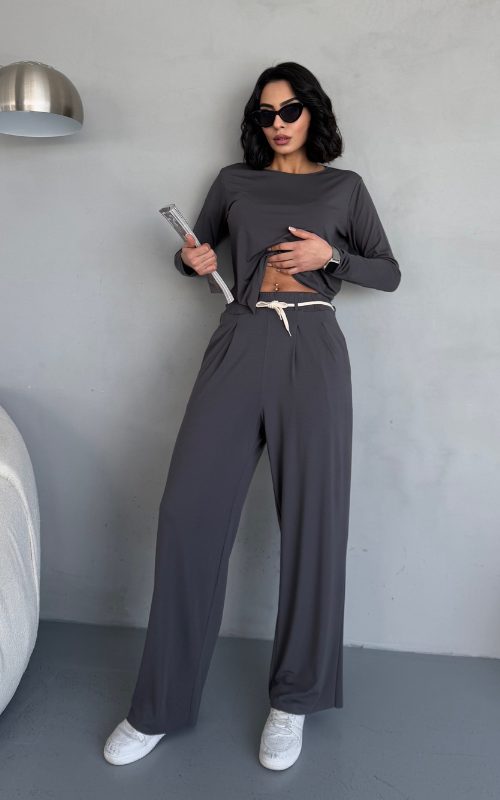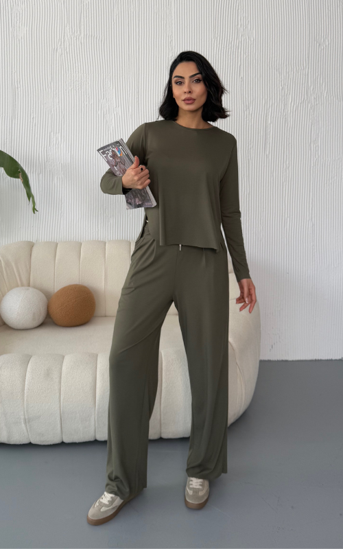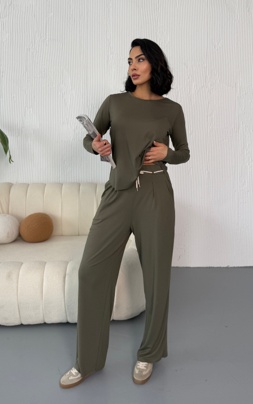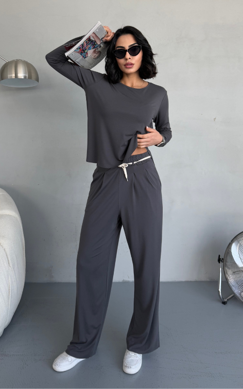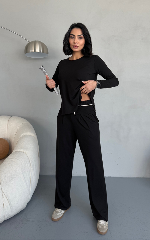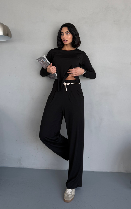 The Sandra Set is a chic matching set featuring a long-sleeve top with a high round neck and pants with unique pleats and a stylish belt. Perfect for a polished and comfortable look.