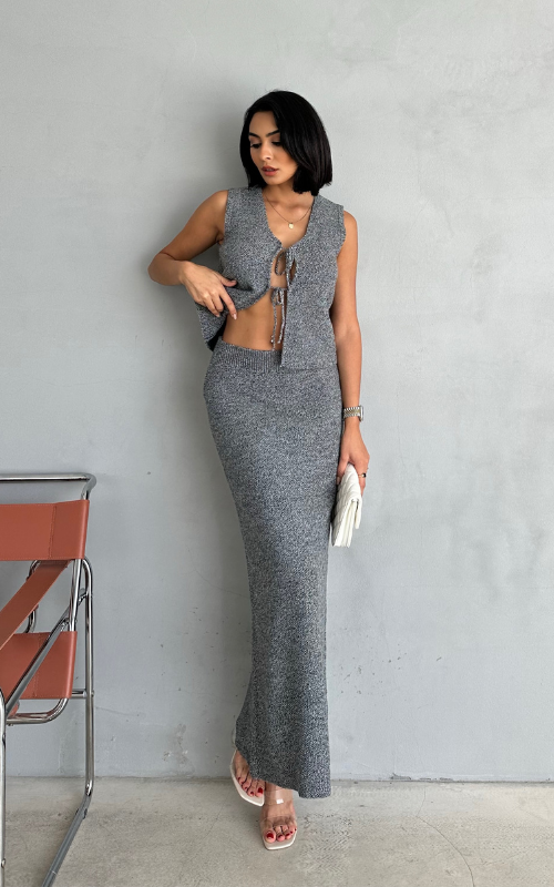 The Sarah Set features a sleeveless top with tie-front detail that adds sophistication to your style, while its matching skirt is made of luxe material.