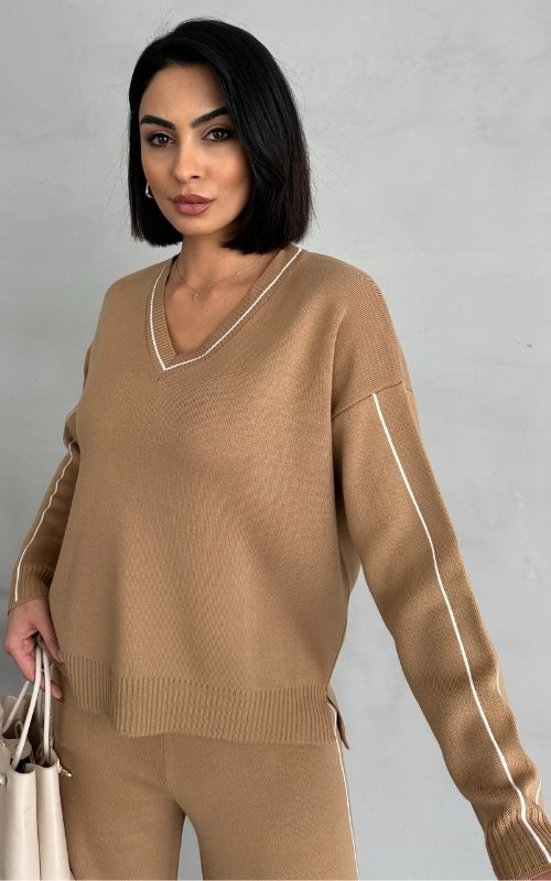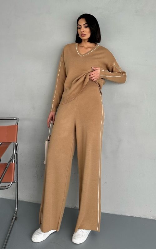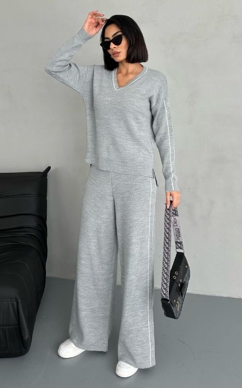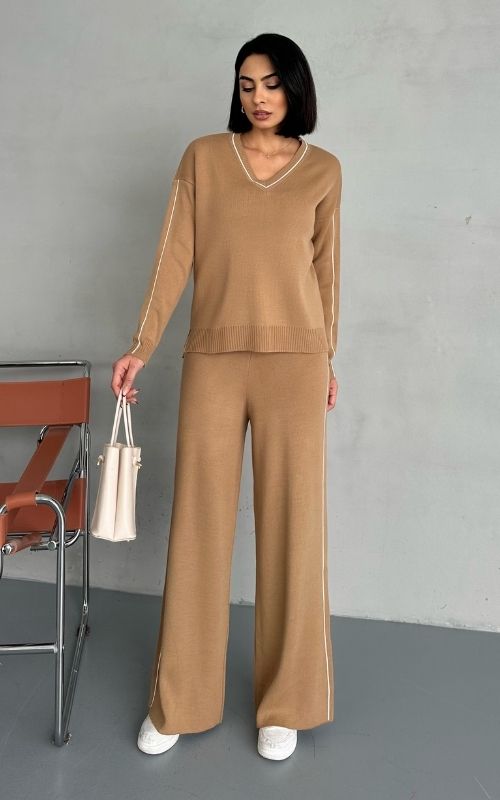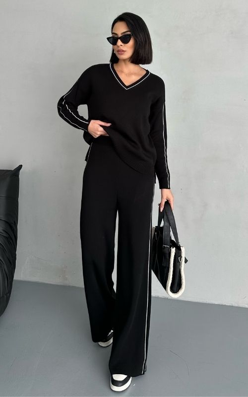 Our Sasha Set features a chic V-neck top with bold straight-line details, making it a true statement piece. Perfectly matched with flare-cut bottoms.