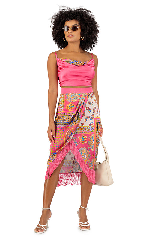 The Sassy Sweetheart Two-Piece Midi Dress is ultra-flattering, fun to wear and just a bit flirty! With its multicolored print, this set will transport you to that free-spirited, summer state of mind. The crop top features a cowl neck, spaghetti straps and a lace-up back. High-waisted skirt has a wrap-style silhouette with an asymmetrical hemline, styled with fringe trim that sways beautifully with every move.