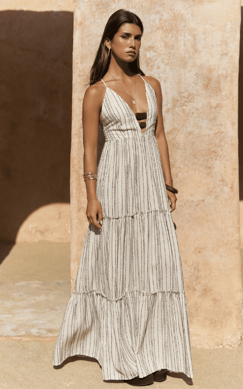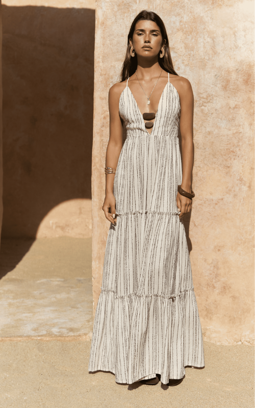 The Seaside Dress is a tiered piece with stripe details, spaghetti straps, and a wide V-neck plunge adorned with statement beads at the chest. Finished with a cross-tie backless design.