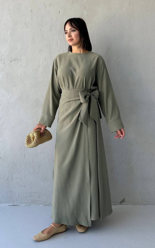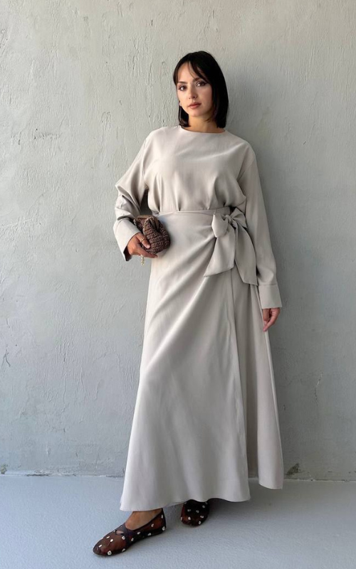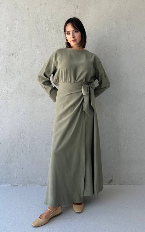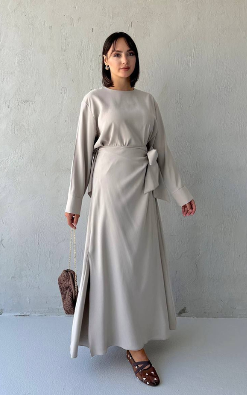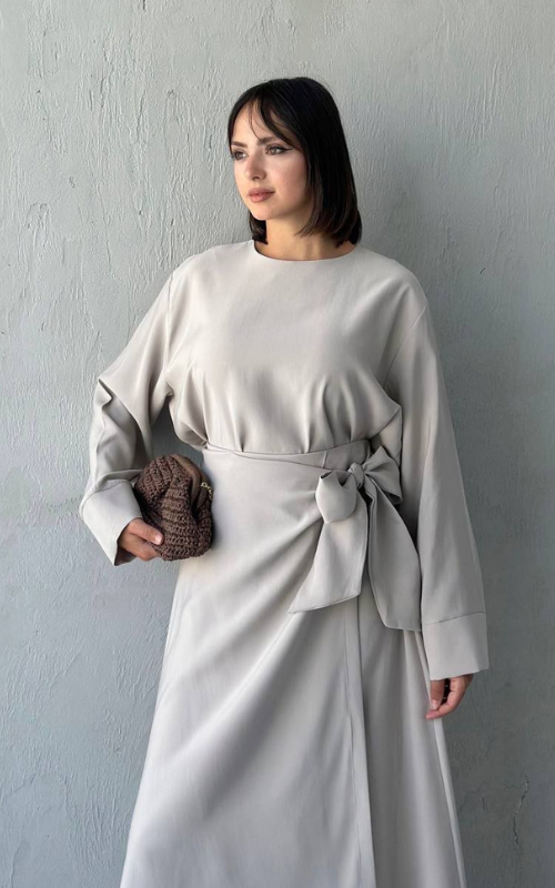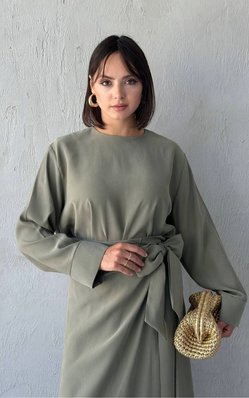 The Sherry Set is a full-length, modest outfit designed with a clean, minimalist silhouette. It features a soft, flowy fabric, long sleeves, and a wide waist tie. The overlap wrap detail adds movement and grace.