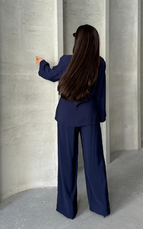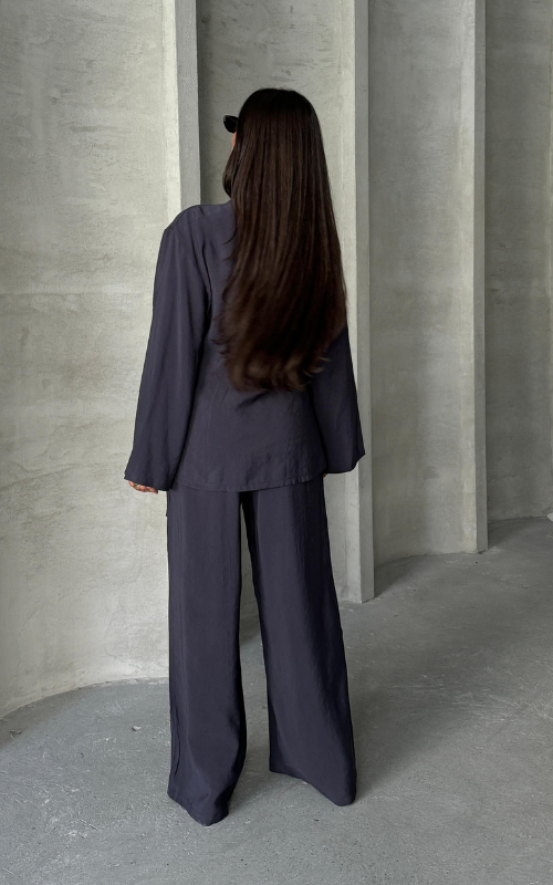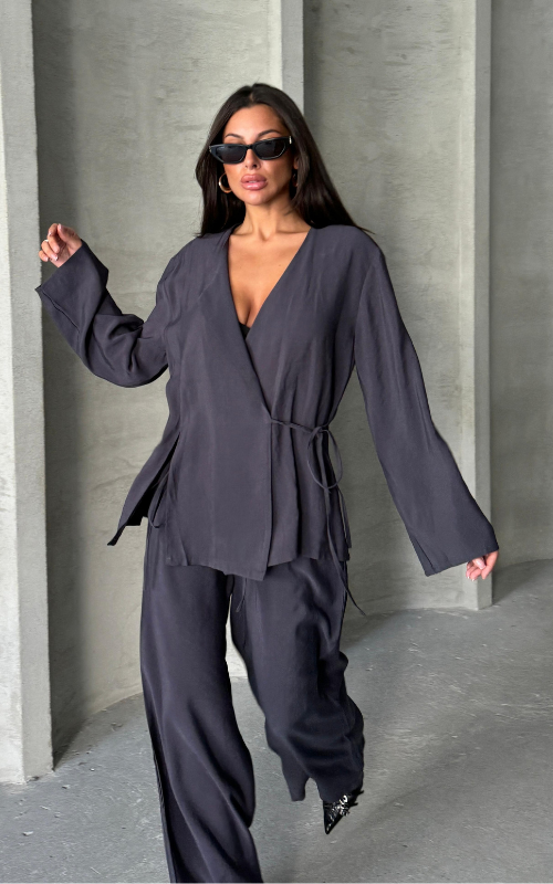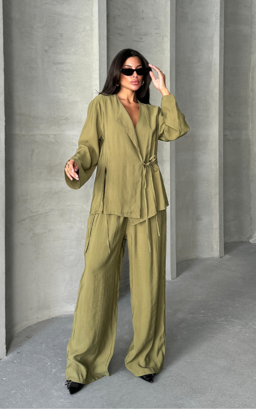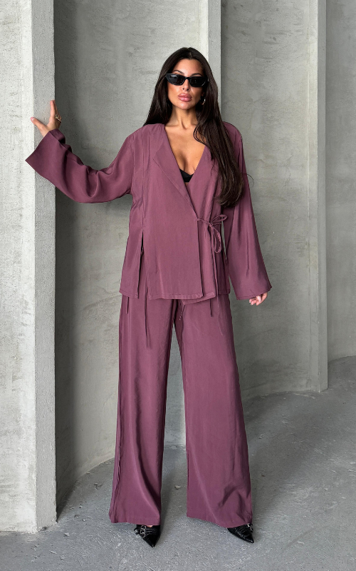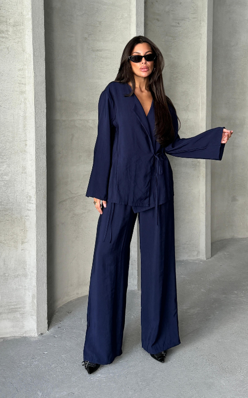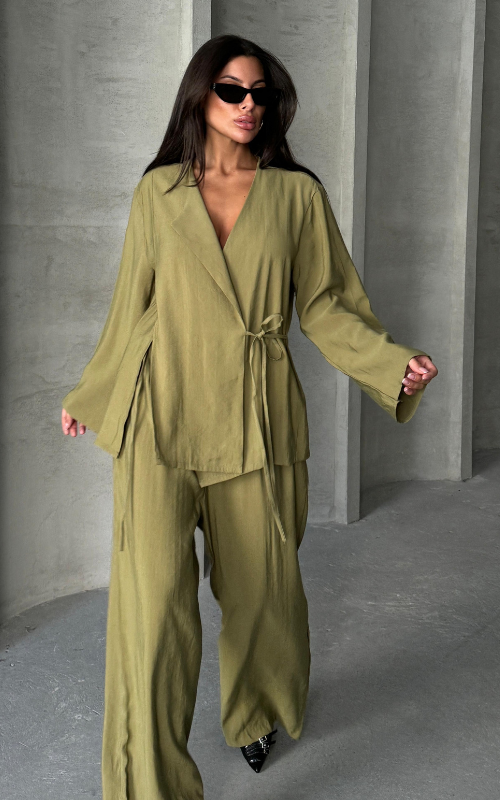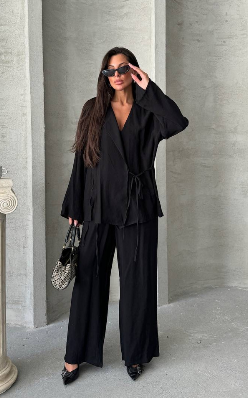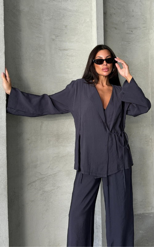 Upgrade your closet and style with our Sindy Set, featuring a kimono style, lace-up top with matching straight-cut bottoms, made of premium fabric.