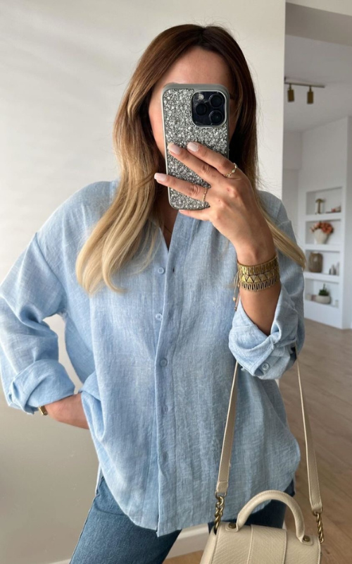 The Skylar light blue linen shirt offers a refreshing and breezy look. Made from soft, breathable linen, this shirt is perfect for warm days, providing effortless style and comfort for any casual occasion.