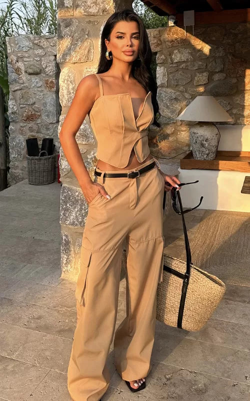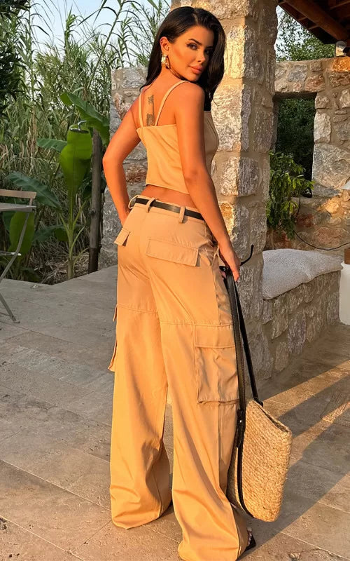 Unleash your urban chic style with our Slay Vibes Set. The cargo trousers offer a chic utilitarian aesthetic, complemented by a stylish décolletage crop top.
