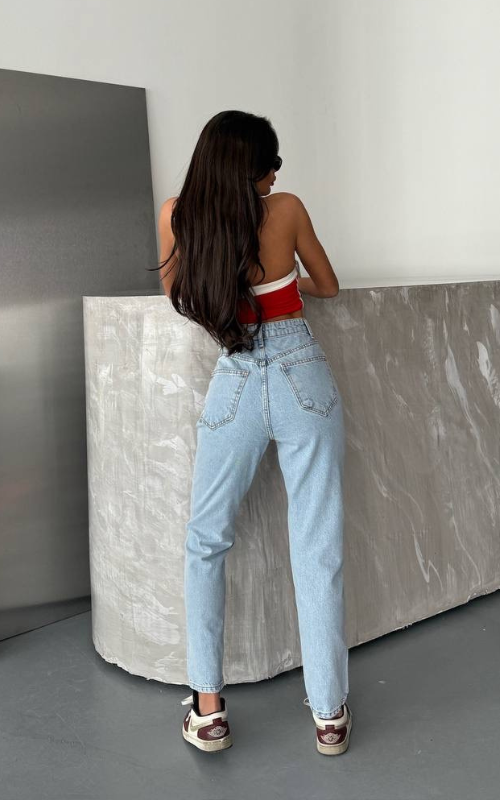Our Solace Pants feature a light blue wash, a high-waist fit, stylish metal buttons closure with zipper, and a tapered cut, offering a trendy and chic vibe.