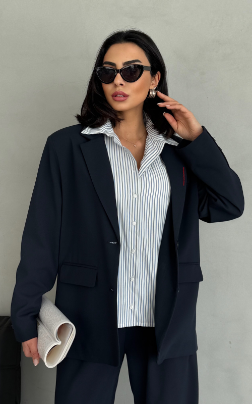 Make a statement with our Static Blazer, an oversized design featuring two flap pockets, a faux upper front pocket, and unique red stitches on the lapel, adding a bold twist to a classic silhouette.