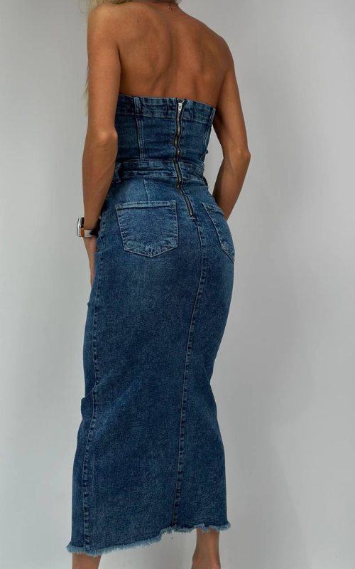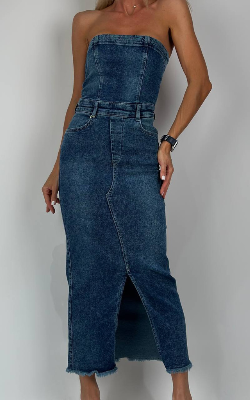 Introducing the Strapless Sensation, a denim dress designed to unleash your inner style goddess. It showcases a split in the back, adding a touch of intrigue to every stride.