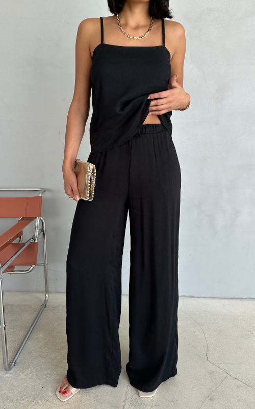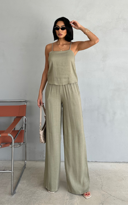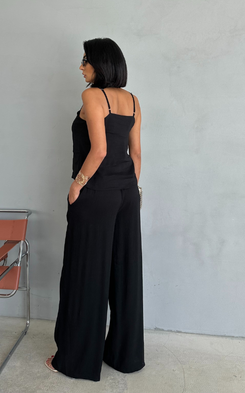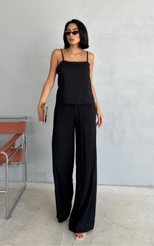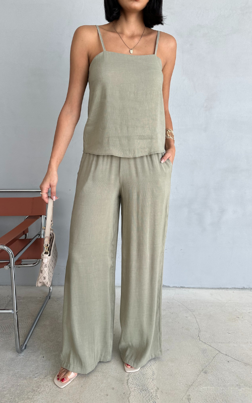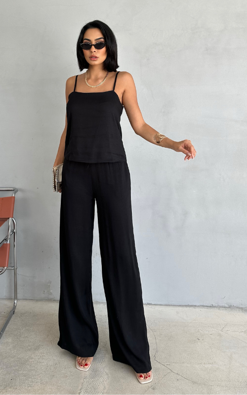 Perfect for casual outings and lounging, our Tanya set comprises of a breezy top that has adjustable spaghetti straps and high-waisted bottoms with drawstring.