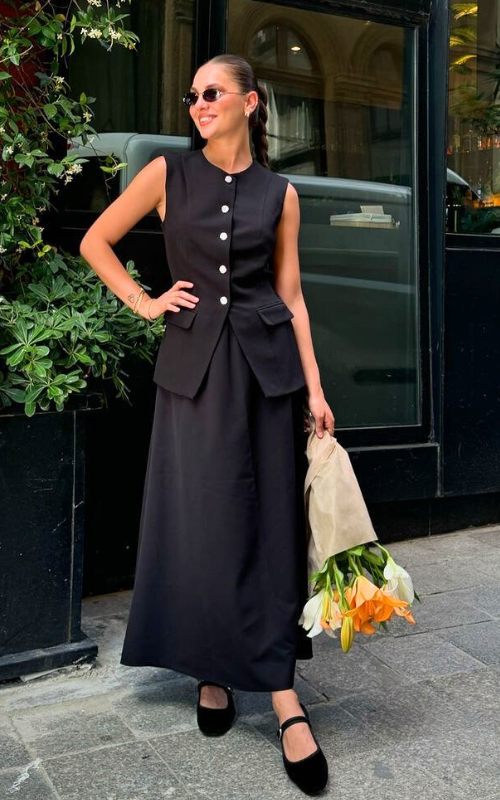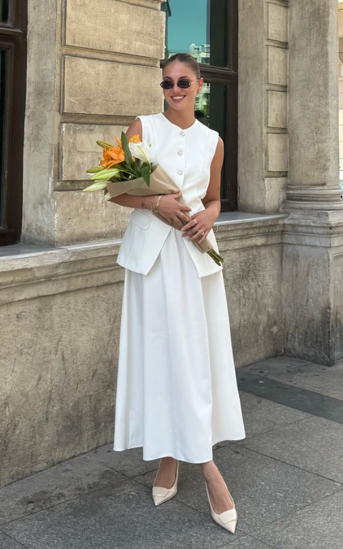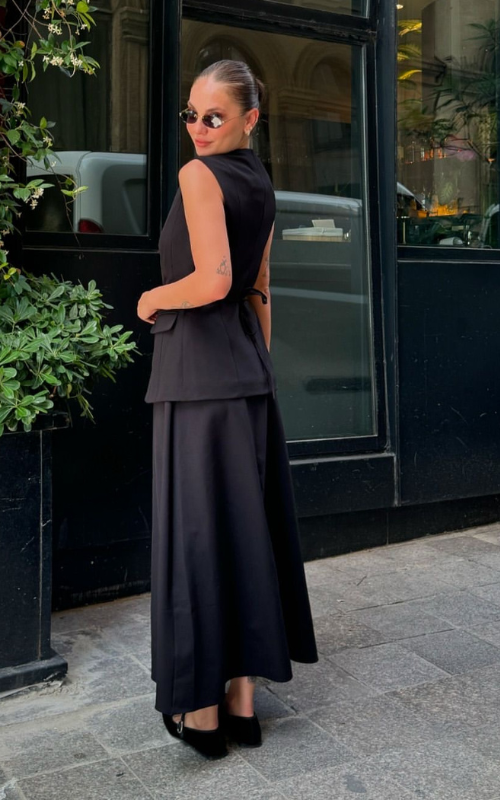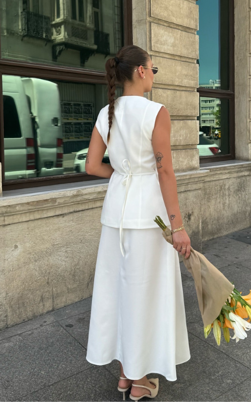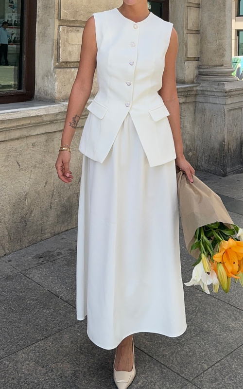 Crafted from the finest fabric, our Taylor Set boasts a statement round neckline vest while the skirts features a statement midi silhouette.