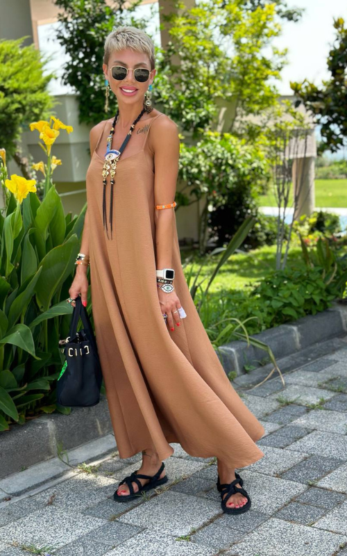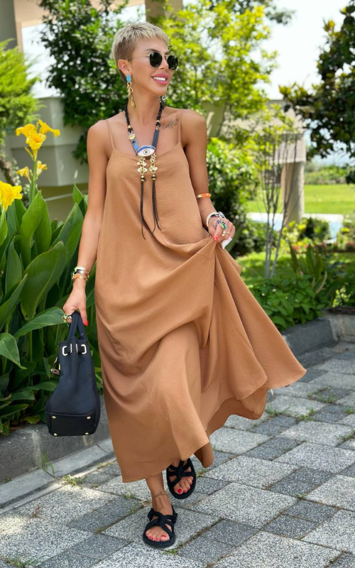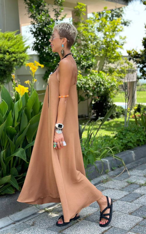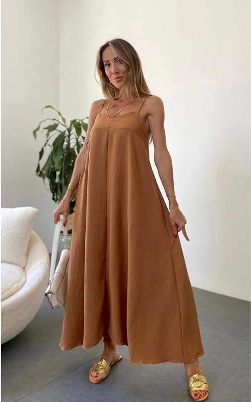 Slip into the Aura, a light and airy dress designed to encapsulate a spirit of relaxed sophistication. Its V-neck design and delicate thin straps add a dash of femininity.