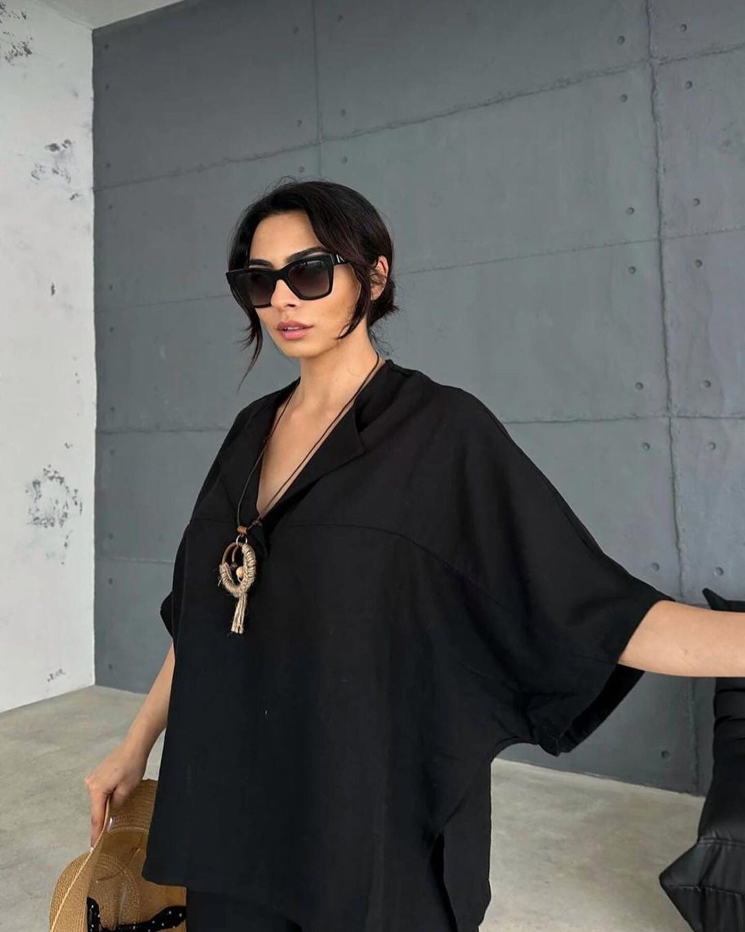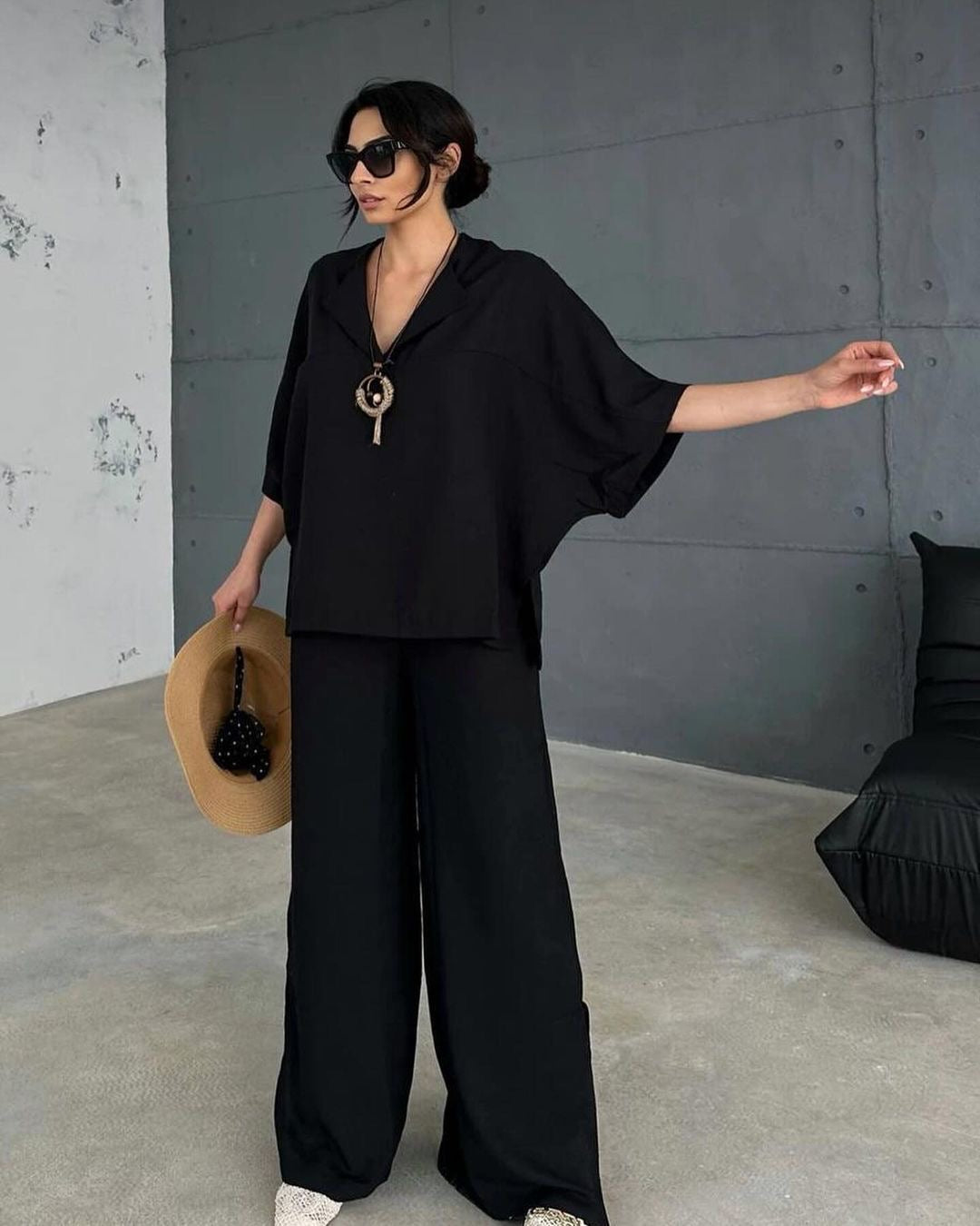 Dive into the sleek design of our The Charm Duo, a sophisticated set of a V-neck blouse and pants, presented with a stylish complementary necklace.