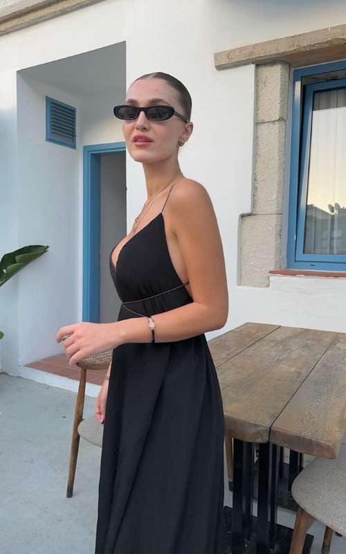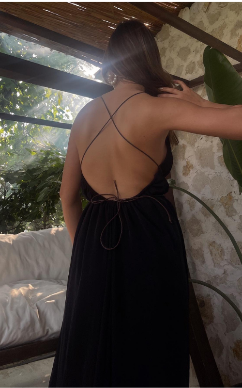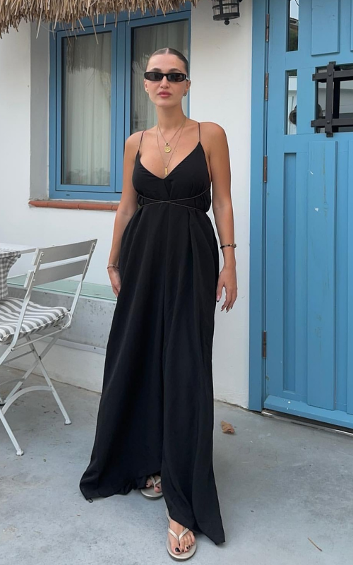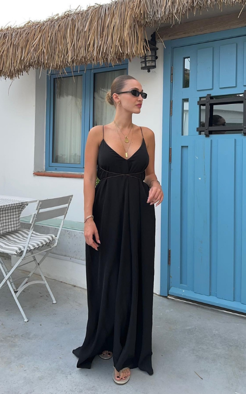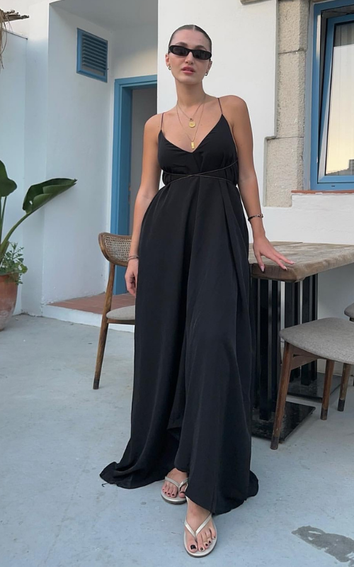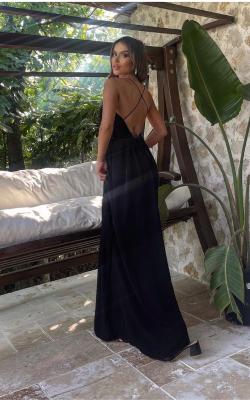 A long, lustrous dress outlined with thin straps, offering the flexibility to style it either crisscross or tie it around the neck.