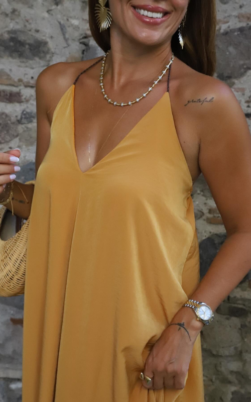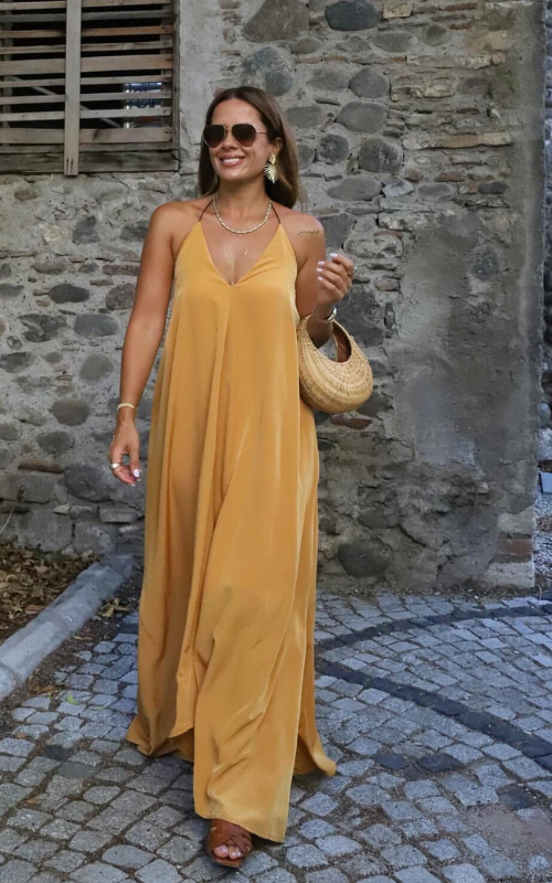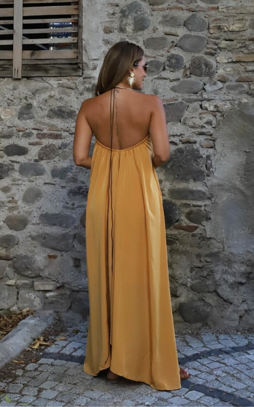 A long, lustrous dress outlined with thin straps, offering the flexibility to style it either crisscross or tie it around the neck.