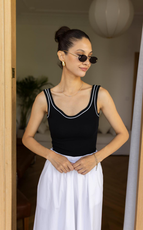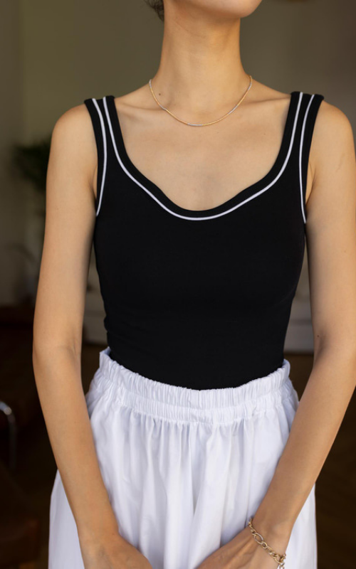 The Nova Sweetheart Tank is a sleek black top with a flattering sweetheart neckline and a chic white stripe along the edge, perfect for adding elegance to any outfit.