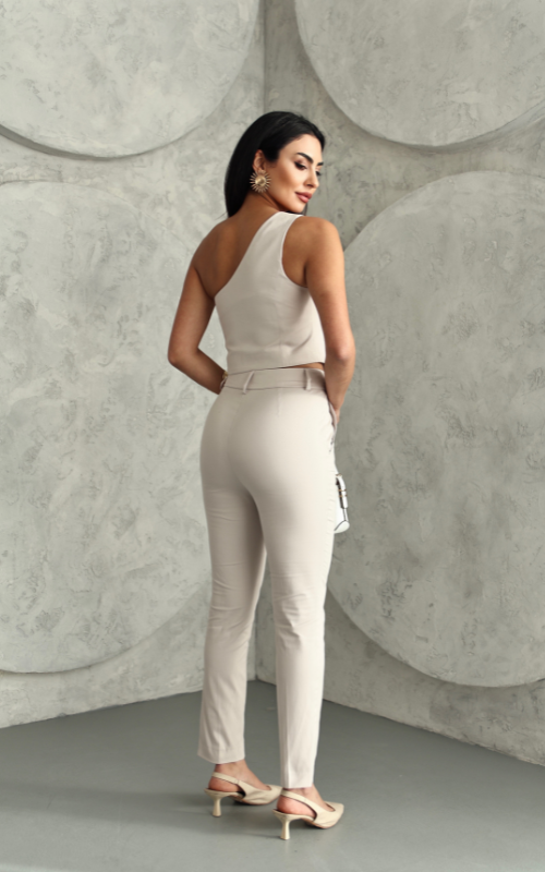 Command attention in this bold co-ord featuring an asymmetrical one-shoulder vest and matching bottoms. With sharp tailoring and modern flair, it’s structured, stylish, and truly unforgettable.