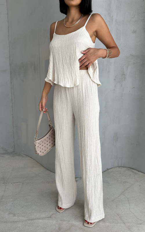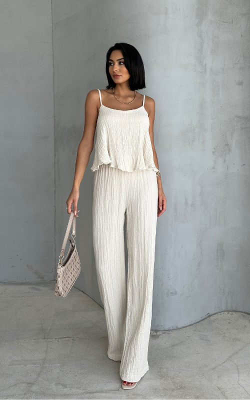 Perfect for casual outings and lounging, our Tina set comprises of a breezy top that has adjustable spaghetti straps and high-waisted bottoms with drawstring.