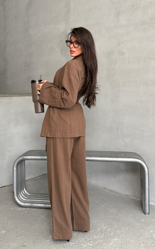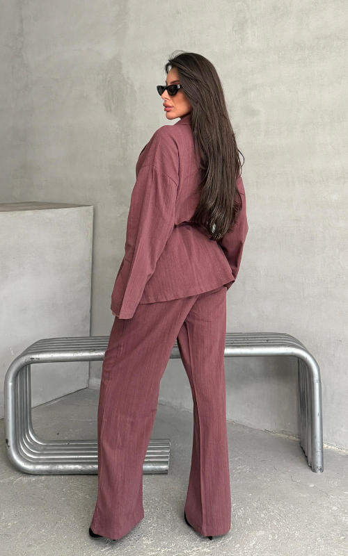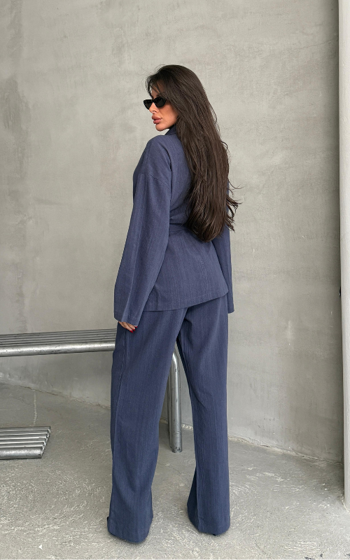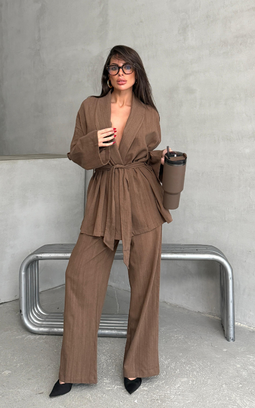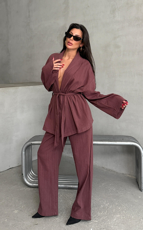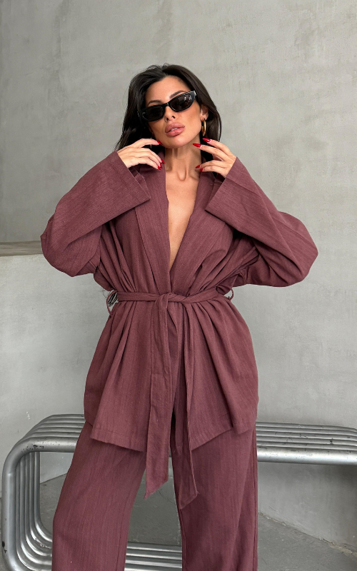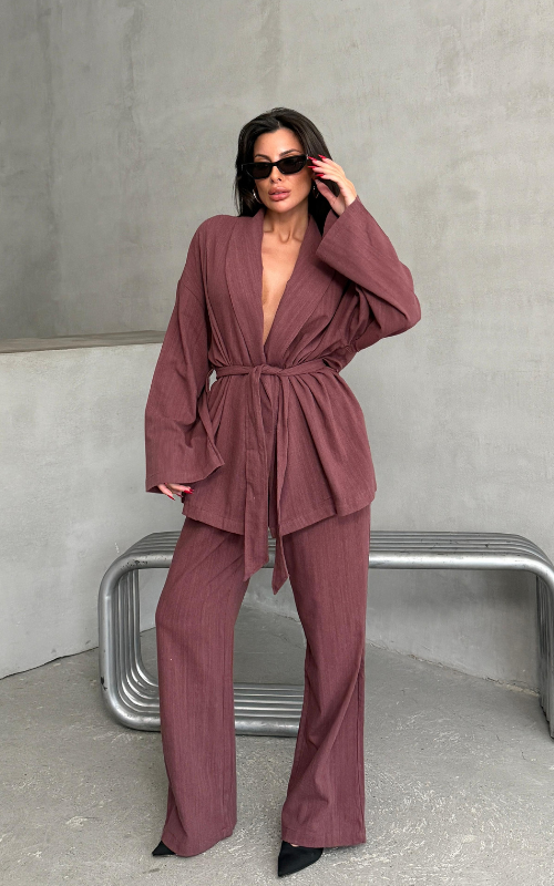 The Tokyo Set features a relaxed-fit kimono-style jacket with a self-tie belt and wide-leg trousers. Made from a lightweight, breathable fabric perfect for warm weather.