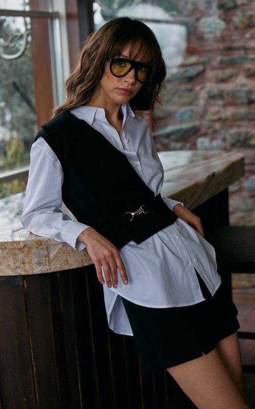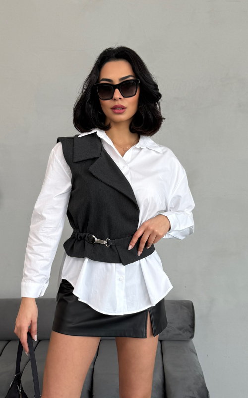 Inject some chicness into your wardrobe with our Tribute Top, a stylish long-sleeved top features a front button closure and comes with an iconic half vest adorned with metal design embellishment.