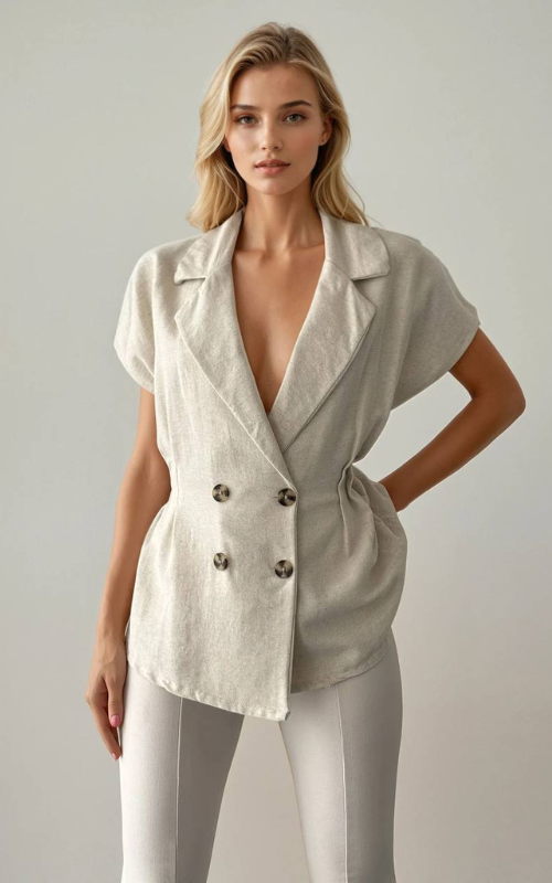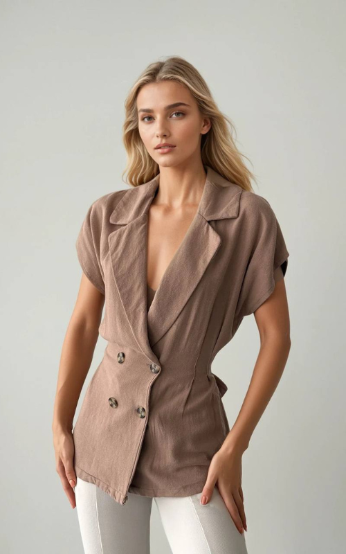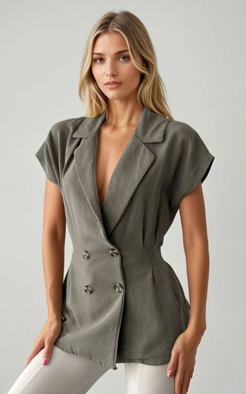 The Uptown Blazer is a double-breasted design featuring a V-neckline, stylish collar, short sleeves and a back tie that adds a flattering, structured silhouette.