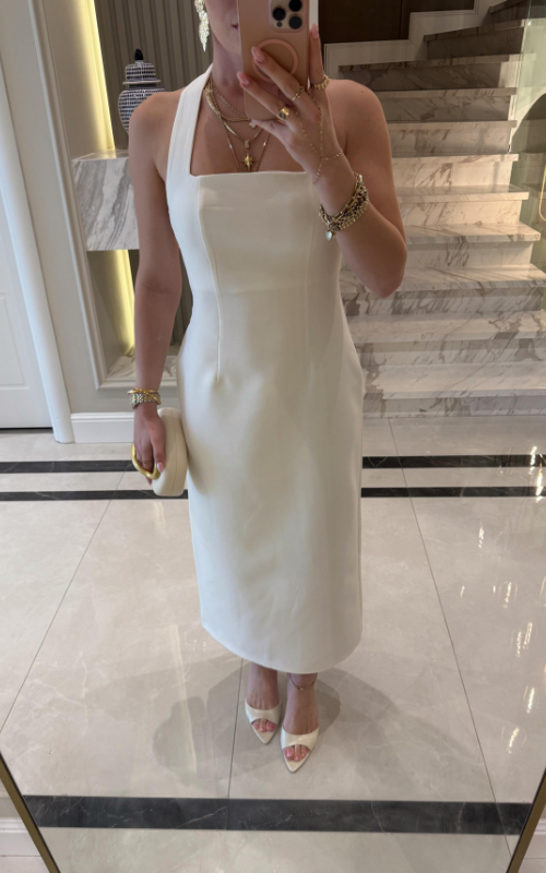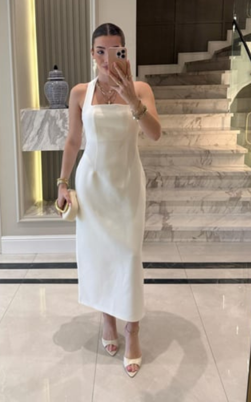 The Vida Dress is a feminine midi-length piece with a sleek halter neck and square neckline, blending elegance and charm for a stylish look.