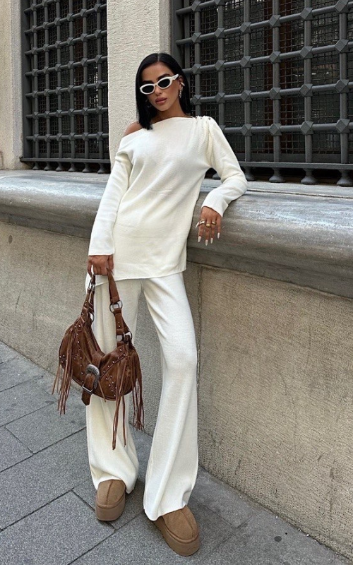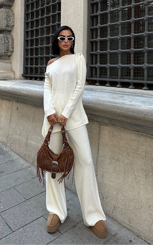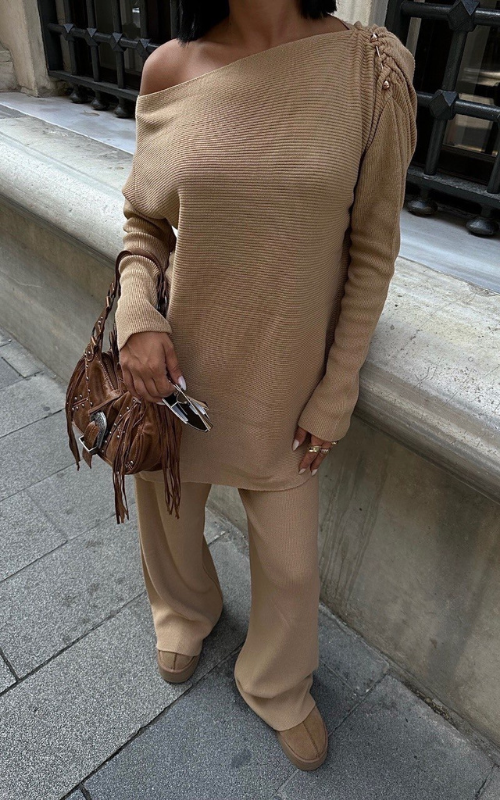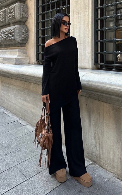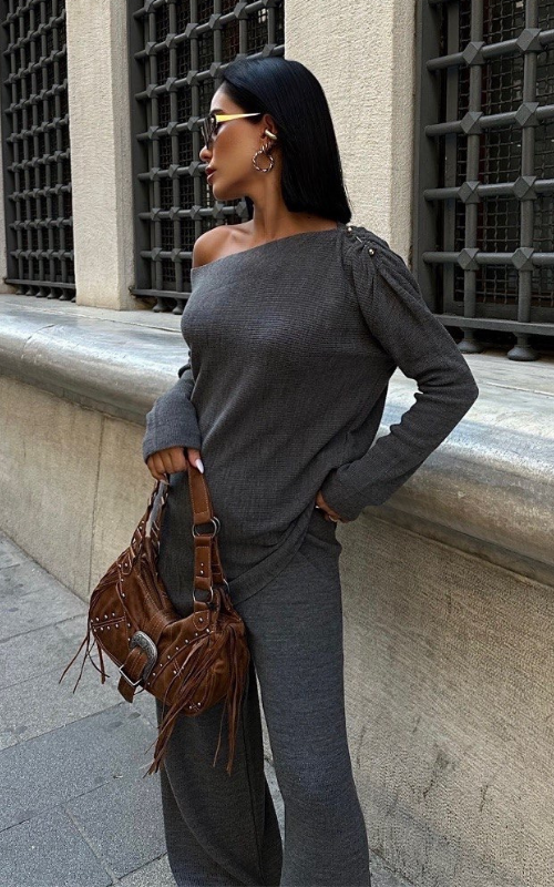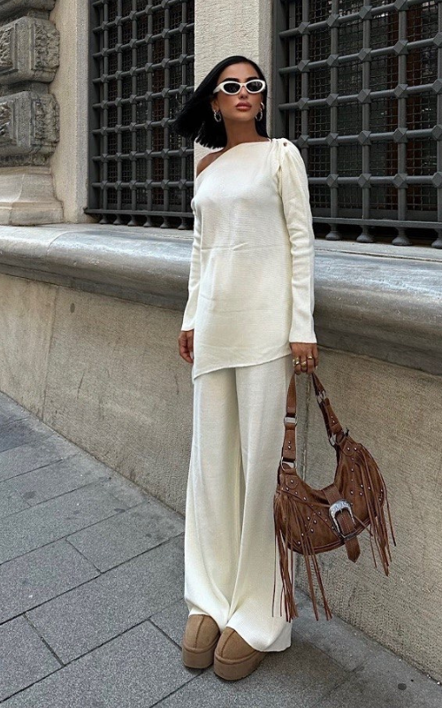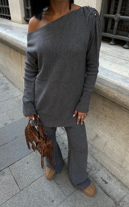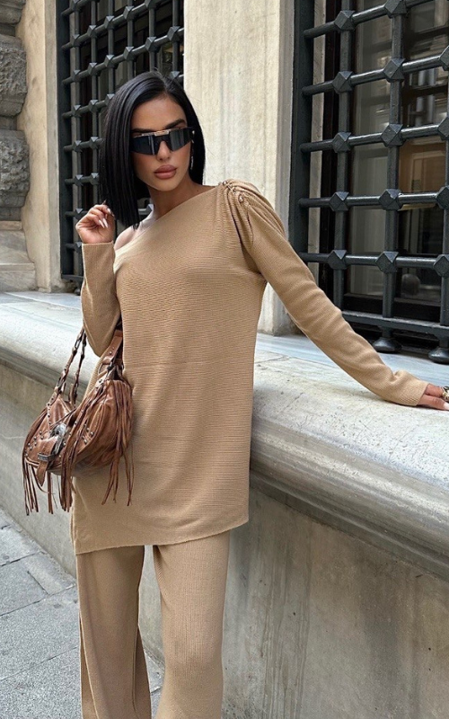 Standout this season with our Vienna Set, featuring an off-shoulder top adorned with ruched detail and stylish brooch, matching with flare-cut bottoms of luxe fabric.