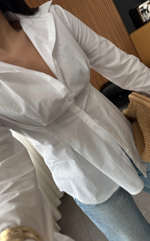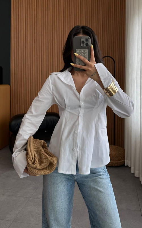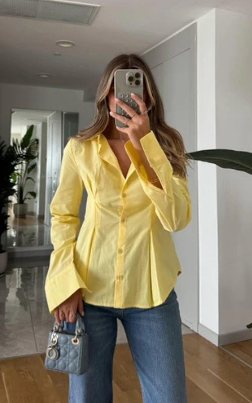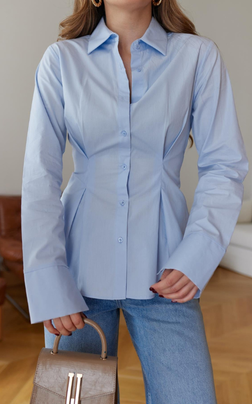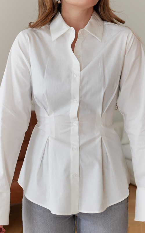 The Virgo Shirt features a chic front pleated design with button detailing, long sleeves, and a wide spread collar.