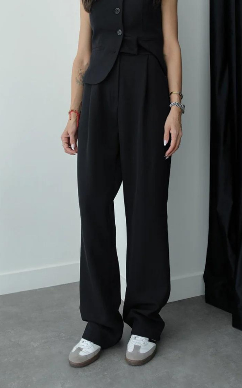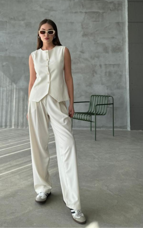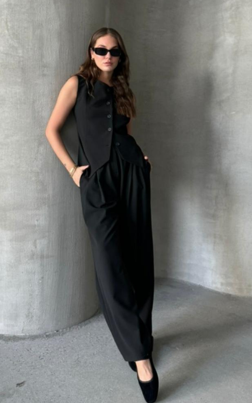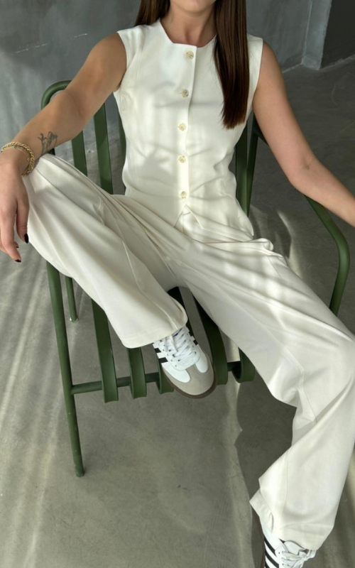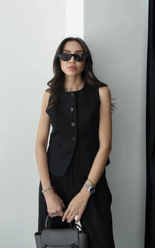 Upgrade your closet and style with our Vivian Vest, featuring a chic round neckline & tailored pockets Pant, elastic waistband.