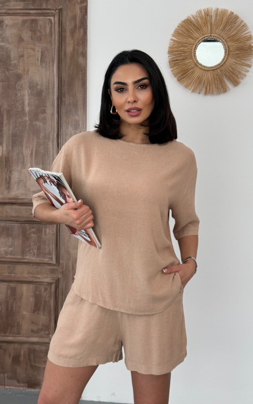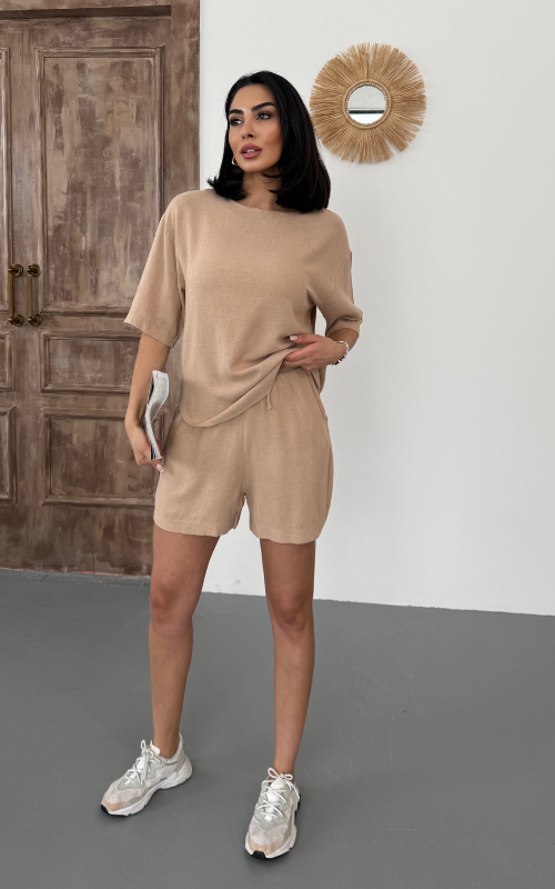 Made to make you stand out, our Wendy Set features a short-sleeved top with a round neckline, paired with matching elastic waistband shorts for a chic and comfortable look.